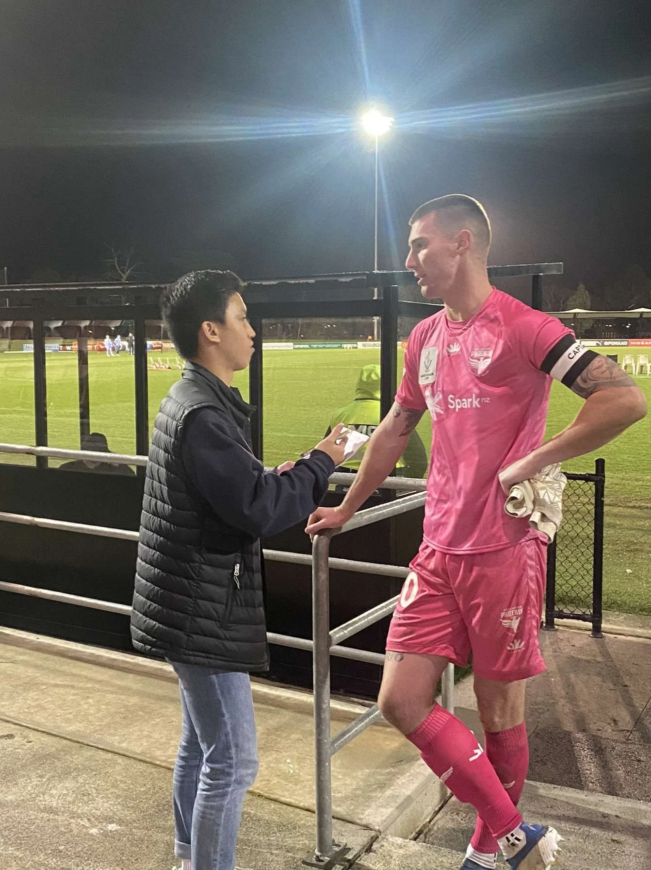 Jullian interviewing Oli Sail post-game at Casey Fields where Wellington Phoenix beat Melbourne City in the Australia Cup Round of 16. (2022)